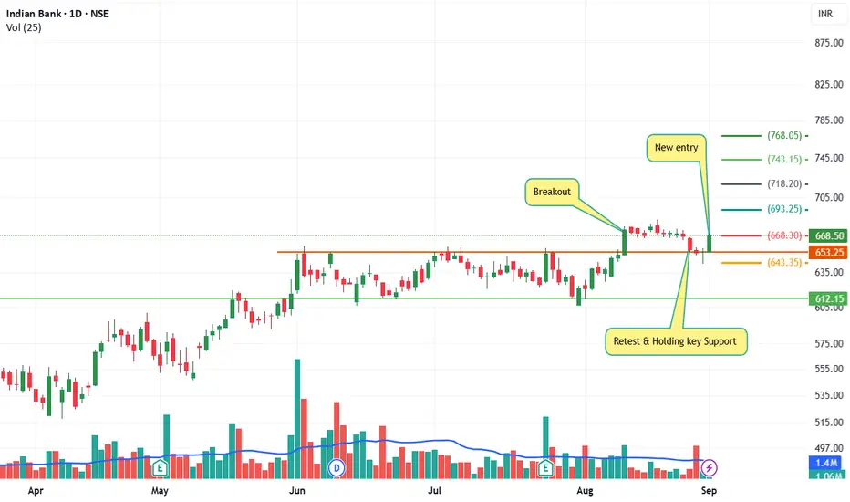 Retest: Price pulled back, successfully retested that breakout level (~₹653) as support.