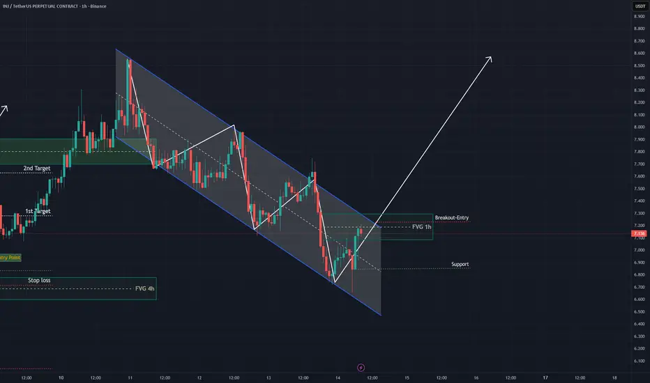 INJ is still trading inside the descending channel, which means a confirmed bullish breakout has NOT happened yet.