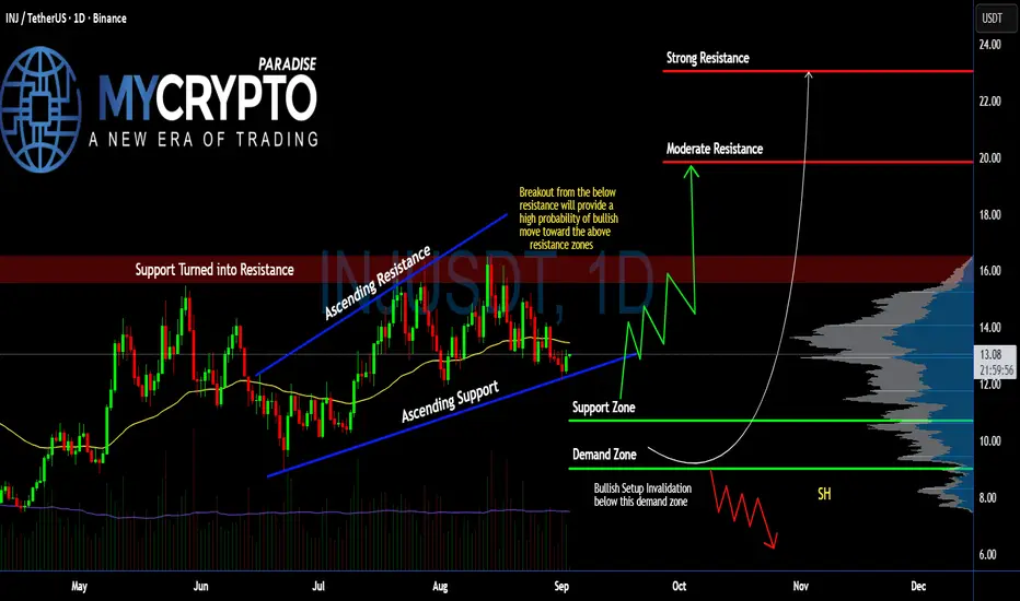 💎After forming a well-defined ascending channel, #INJ has been closely respecting both the ascending resistance and ascending support levels since early July. Currently, price is hovering just above the ascending trendline support, suggesting that buyers are still holding the line around the $12.80–$13 area.