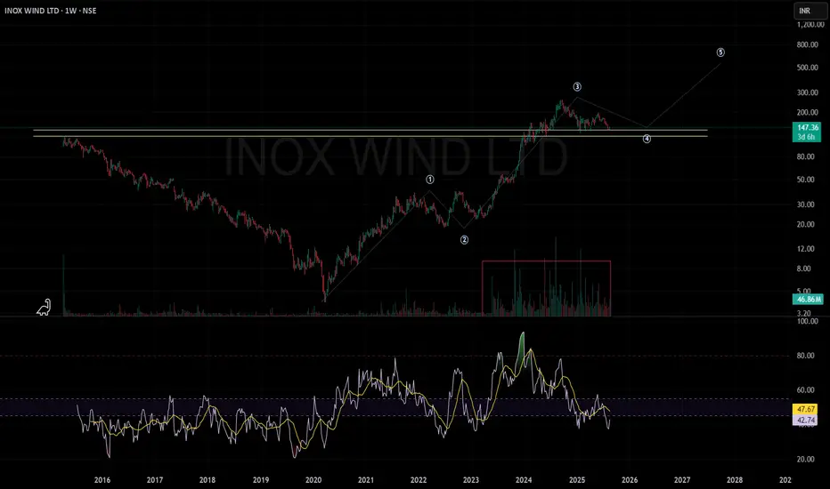 Structure: INOX Wind has completed waves 1, 2, and 3 (Elliott Wave count), now correcting in wave 4 near strong support (120–150INR zone).