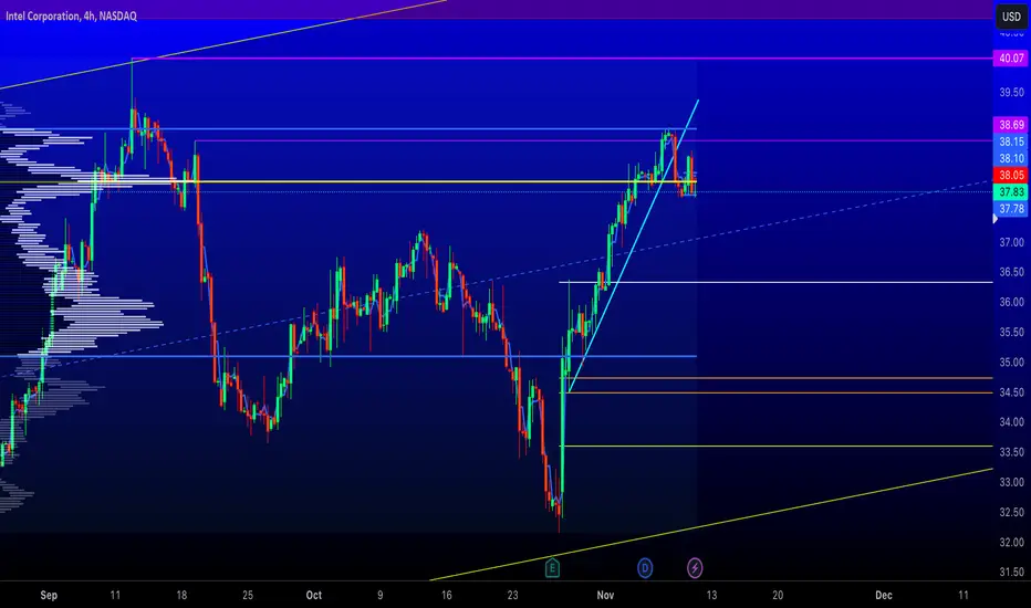 INTC is failed the most recent high, it broke its uptrend and sold off right below the point of control (yellow line). I would expect a sell-off to continue to the .382 (white line which is also the next area with the most amount of volume traded.