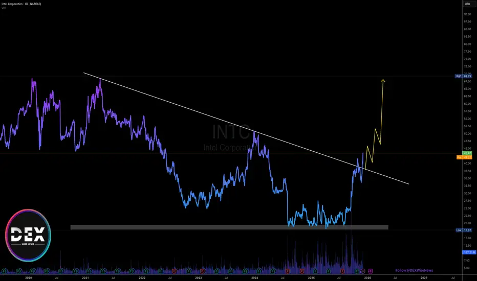 INTC) saw a noteworthy uptick of 8% in Tuesday's extended trading session breaking out of the ceiling of a symmetrical triangle- eyeing the $70 resistant amidst increase in bullish sentiment.