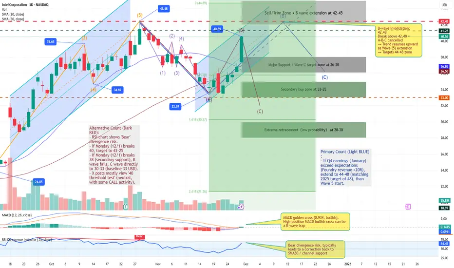• Wave Structure: Primary count (light blue): A-C correction complete; B-wave (zigzag) underway, targeting up to 100% retrace at $42.48 (A-high test)—break above invalidates ABC, signalling impulse wave (e.g., Wave 3 start) with higher targets (45+). Extension to 123.6% ($44.72) unlikely without invalidation, but possible if Q4 earnings beat (Jan 2026). Alternative (dark red): Bear divergence leads to C-wave failure below $38, probing $30-33 baseline.