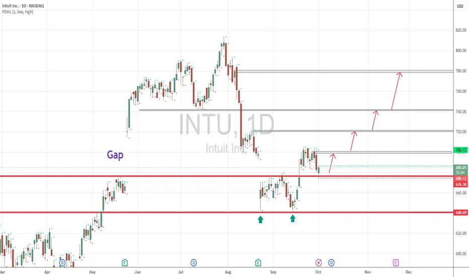 - INTU recently broke above 684 and is currently retesting this level on the daily chart.