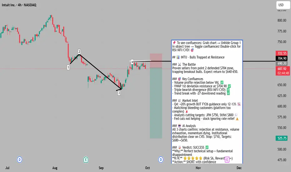 The confluence of technical rejection at proven resistance, bearish divergences across multiple indicators, disappointing forward guidance, and Mailchimp headwinds creates an compelling short setup. While INTU remains a quality company long-term, the near-term technical and fundamental picture strongly favors the bears. The 1->4 pattern completion at VWAP resistance with volume confirmation provides an excellent risk/reward short entry.