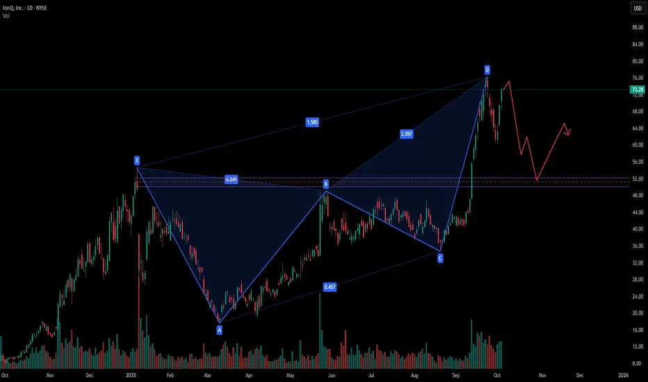 From the current structure, it looks like IONQ may be forming a local top after its sharp rally. The price has completed a bearish harmonic pattern, which often signals exhaustion in bullish momentum.