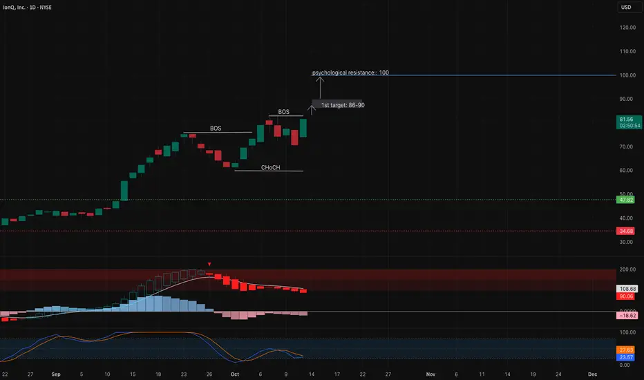 Zooming in, the daily timeframe confirms the same story. After a clean retest of the $66–68 demand area, IONQ bounced sharply and formed another BOS, pushing back into strong bullish territory. The MACD just turned upward, and the Stoch RSI has reset from oversold — a clear sign that momentum is reloading for another leg higher.