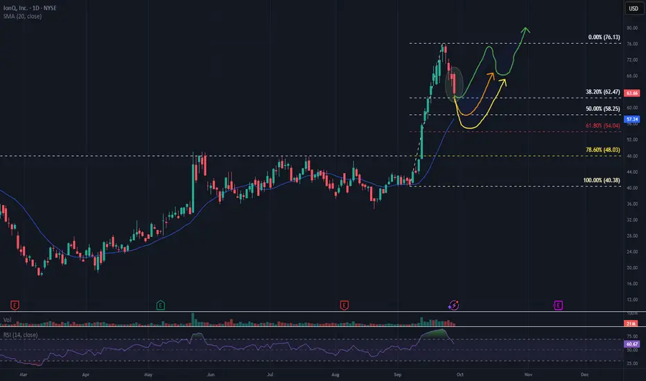 This chart of IonQ, Inc. (NYSE: IONQ) outlines a technical setup identifying three potential buy zones based on Fibonacci retracement levels and anticipated recovery paths: