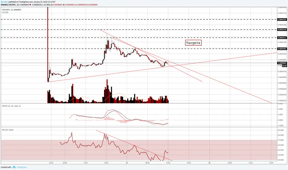 $IOST was listed yesterday on Binance. It had a nice pump & has been consolidating for the last half day or so. The pattern looks strong & RSI broke the down trend. I like this as a coin to snag & hold for a few weeks for a bigger pump. Targets are my initial fib targets where I'll take some profits to average down. Seeing as this coin is new & establishing its price, it does have the potential to move to lower levels so invest responsibly. The fundamentals also look good here - strong backers like Sequoia Capital.