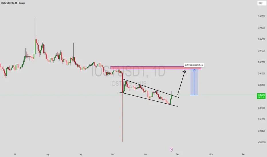 IOSTUSDT is forming a clear falling wedge pattern, a classic bullish reversal signal that often indicates an upcoming breakout. The price has been consolidating within a narrowing range, suggesting that selling pressure is weakening while buyers are beginning to regain control. With consistent volume confirming accumulation at lower levels, the setup hints at a potential bullish breakout soon. The projected move could lead to an impressive gain of around 40% to 50% once the price breaks above the wedge resistance.