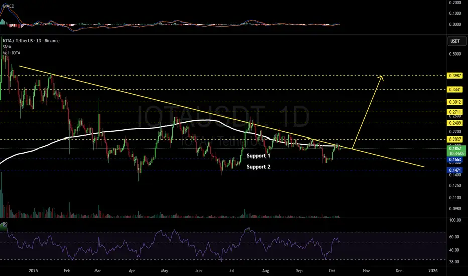 #IOTA is testing the descending resistance and the SMA200 on the daily chart. Consider buying here and near the support levels of $0.1663 and $0.1471. In case of a breakout above both, the potential targets are: