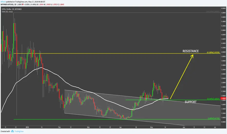 The support has been found at 50% Fibonacci retracement level that is $1.8. At the same time IOTA is rejecting the 50 Moving Average and the upper trendline of the descending channel. If current support will continue to hold, price is likely to move higher, where the next resistance is seen at 61.8% Fibonacci retracement, that is $4 area.