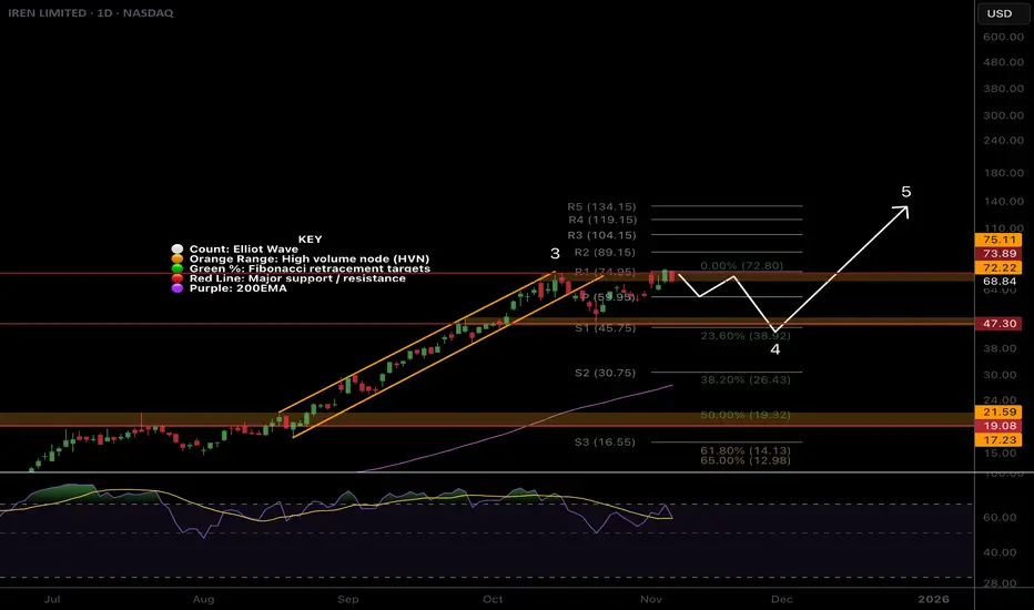 Price has broken out of its momentum channel and formed a range so I am expecting the excitement to trap late comers and traders with a swift reversal in wave 4. Initial downside target is $47 at the High Volume Node and .0236 Fibonacci retracemenet. Stronger downside momentum could test the rising daily 200EMA at the 0.382 Fibs.