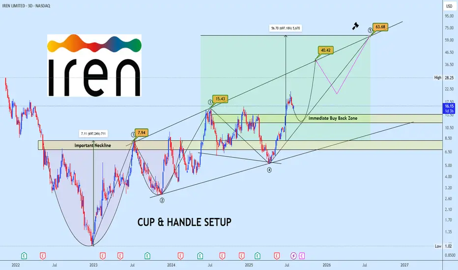 IREN confirms a classic Cup and Handle breakout above neckline, now transitioning into an ascending broadening wedge. Price is pulling back into the buy-back zone, offering a fresh opportunity to ride the next leg up.