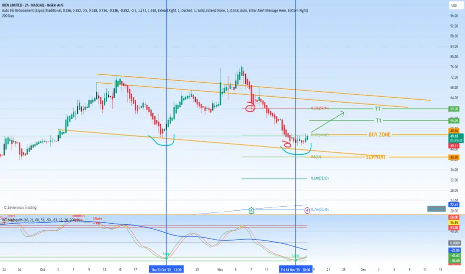 The Bullish Narrative: The bottom appears to be in at the $41 (0.50 Fib) support. The strategy is to look for entry opportunities, ideally on a pullback towards the $49.47 (0.382 Fib) buy zone, especially if it coincides with a confirmed buy signal from your indicator (the blue vertical lines). The subsequent targets are $55 and $59.