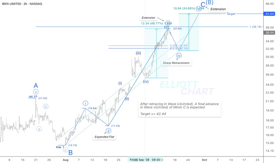 Currently, a pullback in Minute Wave iv (circled) may have begun, targeting the Fib 0.236–0.272 retracement zone. This sets the stage for a potential final advance of ~35% in Wave v (circled), which would complete the ongoing Minor Wave C structure — with 🎯a projected target of 42.44.