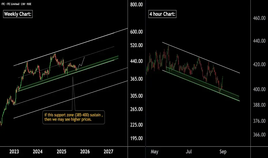 On the 4-hour chart, ITC is forming a falling channel, with support also placed around the 390–400 zone. If this level holds, we may witness a potential upside move in ITC.