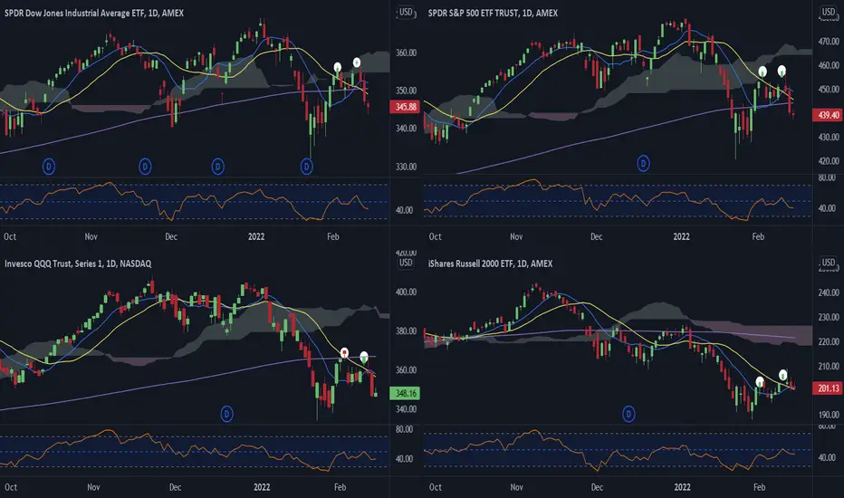 I am using index ETFs here since I use them for option trades and they are so widely traded. Study DIA, SPY, and QQQ and note the double top similarity as it corresponds to RSI. DIA and SPY were a little stronger in that RSI showed a double top above 50. QQQ had an earlier 20 below 200 ma cross, so it is weaker and its RSI did a double retest of 50. Friday's candle broke the lows on these three charts and technically triggered more downside.