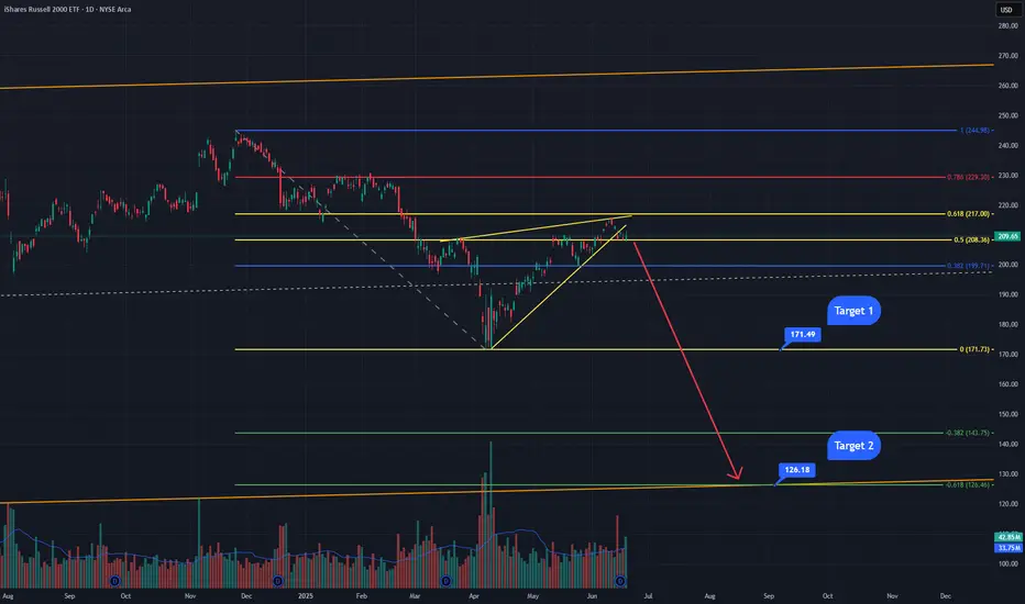 The IWM has been trading inside this upward sloping wedge/bear flag for a few months. It just broke the bear flag this week and then tested the underside of it as resistance before getting rejected. This area also happens to be a golden pocket retracement zone from a Fibonacci I have drawn from the all-time highs made in November of last year to the lows made 2 months ago in April. The next probable move is back down to target 1 at the bottom of the Fibonacci retracement at $171. These golden pocket retracements have a very high probability of moving back down to the bottom of the retracement, sometimes breaking lower. This area at $171 has a lot of support but if it breaks, I expect it to come down to the orange line which is an upward sloping paralell channel that the IWM has been trading in since the financial crisis of 2008. The bottom of said channel connects the 2009 lows through the covid lows of 2020. This area also happens to be the -0.618 Fibonacci retracement area, it would be the 3rd hit of the bottom this major weekly channel and would very likely contain the lows for the current bear market.