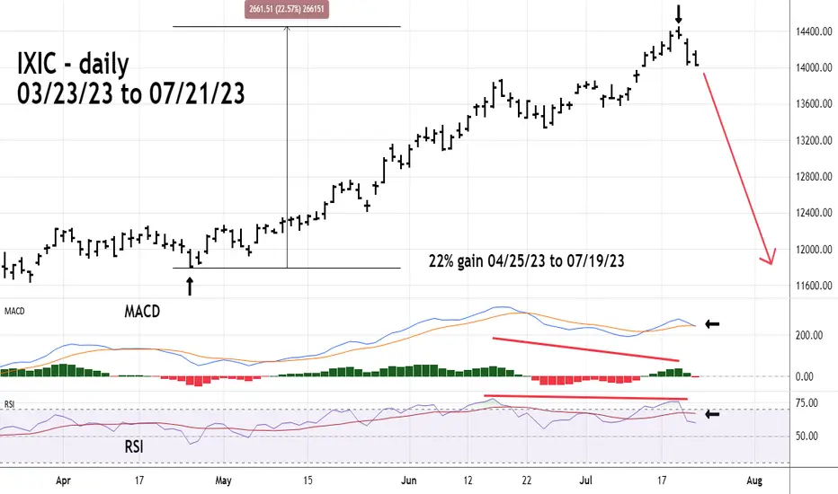 Now IXIC is leading the way down. Note on the 07/19/23 peak the bearish divergence on both MACD and RSI. MACD also has a bearish lines cross, while RSI has moved below its moving average line.