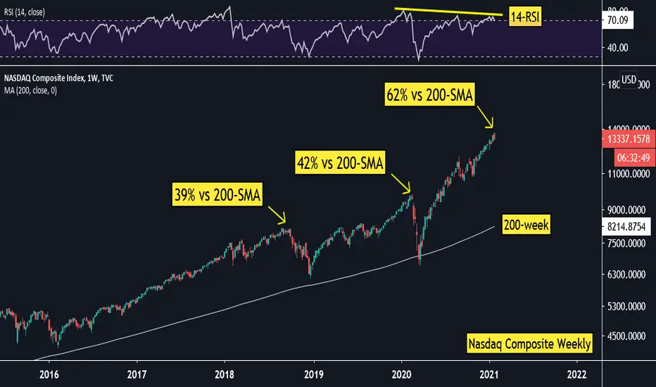 Technology sector earnings remain fairly strong and there’s ample liquidity being provided by the US Federal Reserve, however it may be worth noting that the index trades 62% above it’s 200-week SMA. Prior extensions: +42% (Feb 2020) & 39% (Oct 2018). Should the index close at current levels or lower, the candle structure would be a ‘dark cloud cover’ as per the weekly chart. In addition, the weekly chart RSI has developed lower highs (negative divergence). While it may drift a few points higher, the risk to reward does not appear attractive from a buy/long perspective. Caution to those who are overly optimistic on US Technology shares. Last Close: 13337