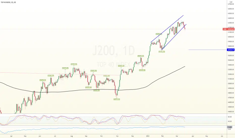 - Uptrend is at risk and below 60200, one can expect a deeper pullback with a measured moved possibly lining up with the bottom of the wedge pattern
