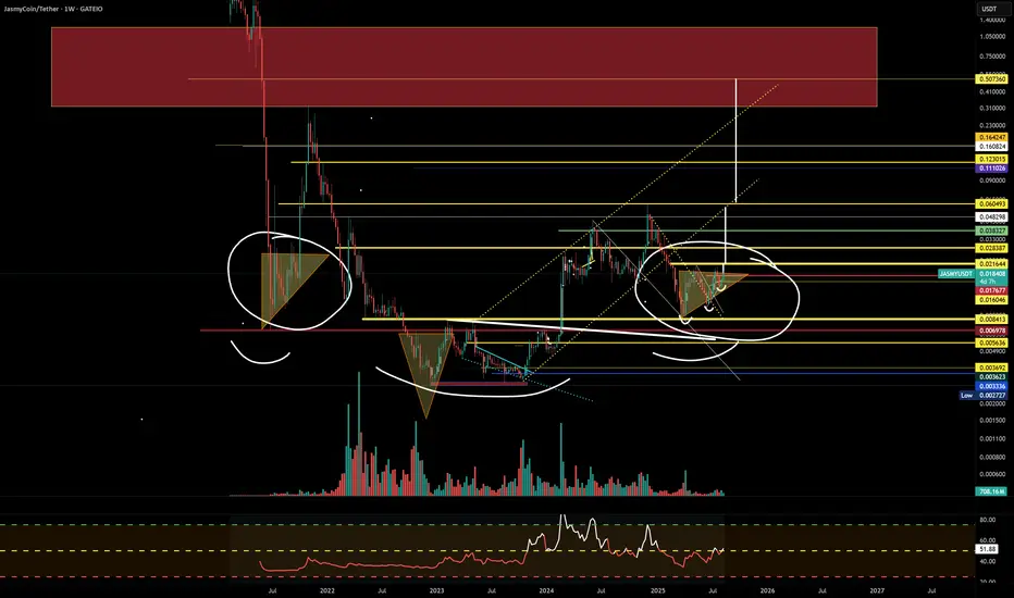 Been following JASMY for a couple years now...took it from the lows and sold waiting for the macro right shoulder to form. No coincidence that it is putting in the same macro weekly ascending triangle on the right shoulder that it did on the left shoulder from 2021. It held the other day while the market dumped and it now in a LTF bull flag formation. If it runs back to neckline of the ascending triangle it could be a cascade breakout the likes of 2021. Good luck