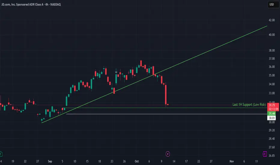 From a technical standpoint, JD has broken below its short-term uptrend, which had been supporting the bullish move since early September. The breakdown accelerated as the tariff headlines hit the market, pushing price toward the $31.8–$30.8 support zone — a level that historically attracted buying interest.