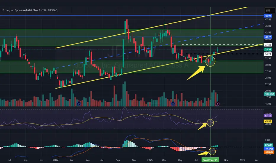 JD looks to have put in a strong bottom near the yellow channel low. 3 Doji Candles in row for the last 3 weeks... + RSI momentum shift + MACD bullish cross + volume increasing..... all point to potential swing toward the pivot point ($40–42) and potentially the channel top ($48–49) if bulls step in (long term) will be interesting to see what happens. (there was a reason i alerted JD calls the other day that opened up ITM today in my free discrd.... I SAW CALLS FLOWING INTO IT.....) Thoughts? Anyone else eyeing JD?