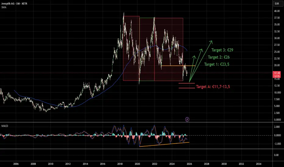 Jenoptik (starting point: €17.20) appears to be preparing for a bullish movement in the medium to long term. While short-term volatility may lead to a retracement into the support range between €11.70 and €13.50, representing a potential correction of up to -32%. This zone is viewed as a strategic accumulation area.