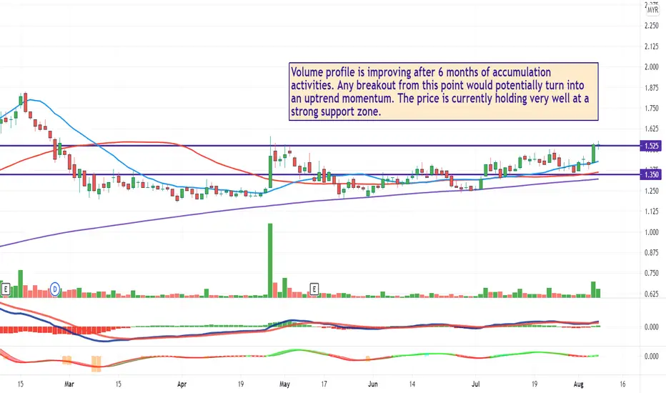 Volume profile is improving after 6 months of accumulation activities. Any breakout from this point would potentially turn into an uptrend momentum. The price is currently holding very well at a strong support zone.