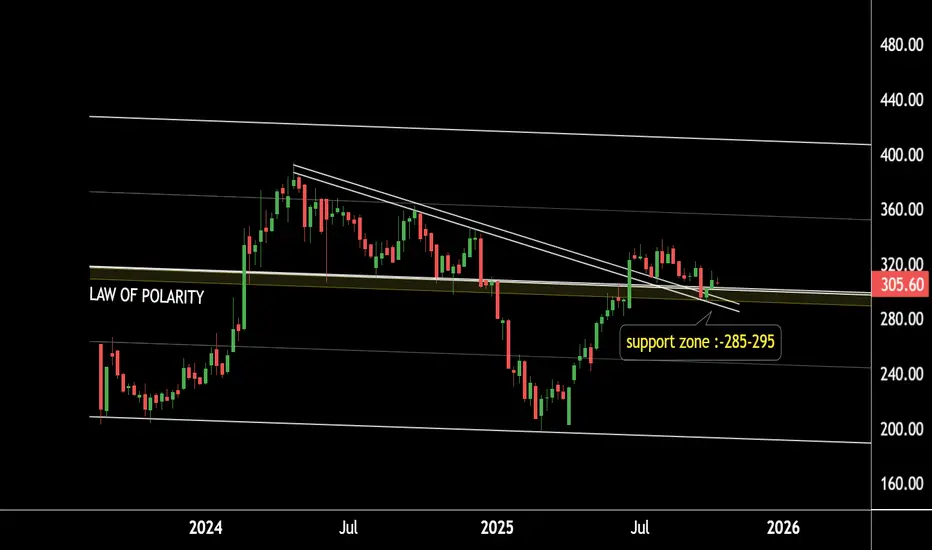 The stock is currently holding above a key law of polarity support zone around the ₹285–₹295 range.
