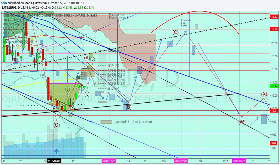 If wave 5 of C is not complete then Jnug might drop all the way to mid $7 down to $6.25 before shooting back up. So lets keep that in mind. While I do believe we move up early next week, IF this new theory is correct, then the most upside we may see could end at $15.73.