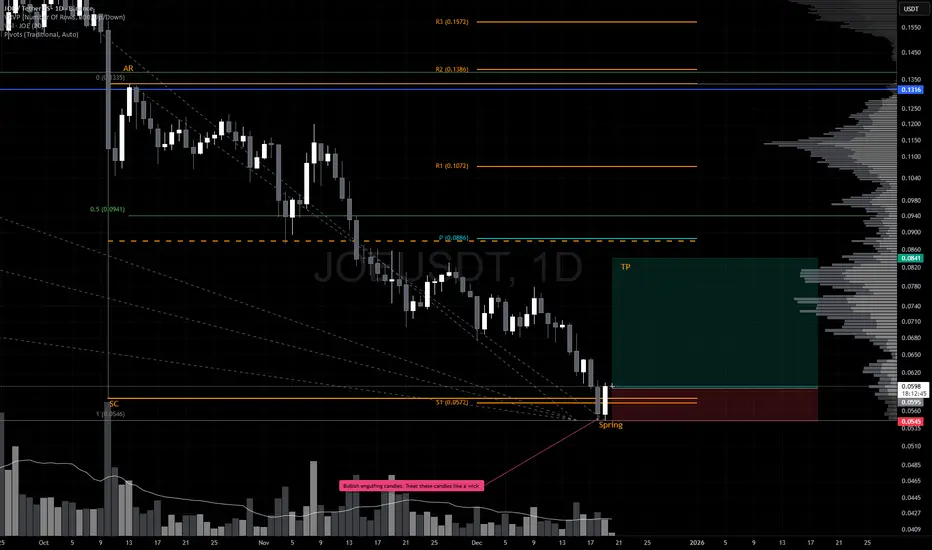 Initial TP would be just below the range EQ which lines up with the yearly pivot and 50% of the range retracement. From here, if the price can close, hold and form higher lows above this level, would strongly suggest that a bottom is in. The next meaningful upside target sits around $0.1296, where prior resistance and structural alignment converge.