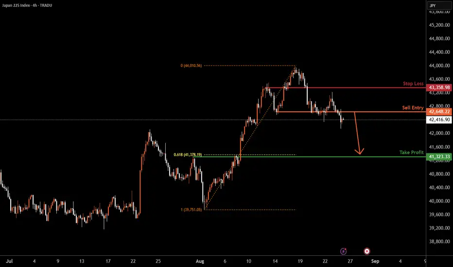 JPN225 is rising towards the sell entry at 42,648.22, which is a pullback resistance and could reverse from this level to the downside.