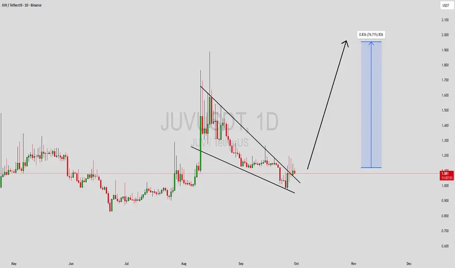 JUVUSDT is currently forming a falling wedge pattern, which is widely recognized as a bullish reversal signal in technical analysis. This setup shows that the price is compressing downward with lower highs and lower lows, but with decreasing selling momentum. When combined with strong trading volume, the probability of a bullish breakout increases significantly, giving this coin the potential for a 60% to 70%+ upside move.