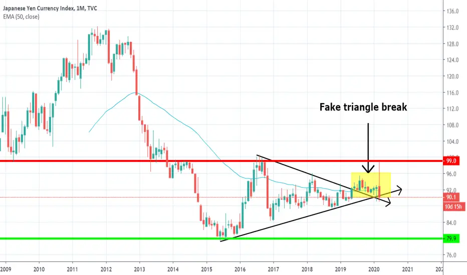 In 2019 we had what, at that point, seemed to be a break to the upside (Jpy pairs weakness) of a triangle. The beginning of March came with a big reversal from 100 zone resistance and Jpy index is trading now at 90 support zone. I expect this support to be broken and 2020 be dominated by Jpy weakness (JPY pairs uptrend)