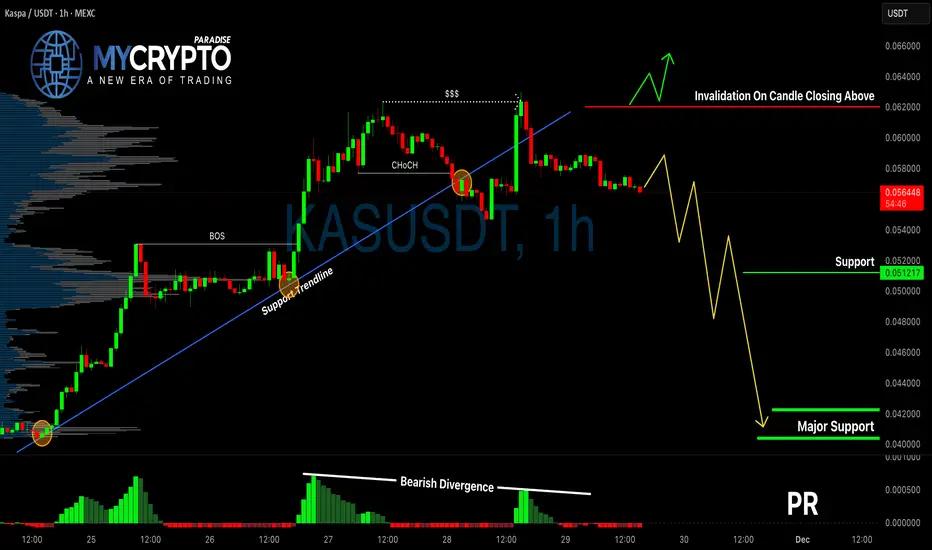 💎KASUSDT has officially broken below a critical supportive trendline, which was previously holding the structure intact. This breakdown wasn’t random—it came with a clean bearish CHoCH (Change of Character), and the MACD histogram is flashing a clear bearish divergence. These combined signals significantly increase the probability that this is not just a minor pullback, but the beginning of a more aggressive downside move.