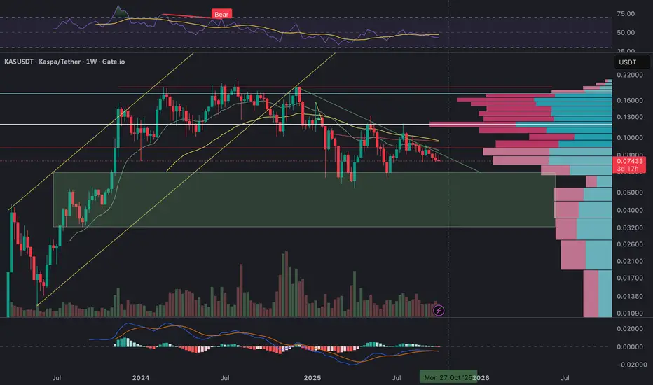 From a structural point of view, KAS remains in a macro corrective phase. Momentum indicators are showing signs of exhaustion on the downside – the RSI is hovering near the 40 level and flattening out, while MACD has started to compress with a potential bullish crossover forming if buyers step in this week.