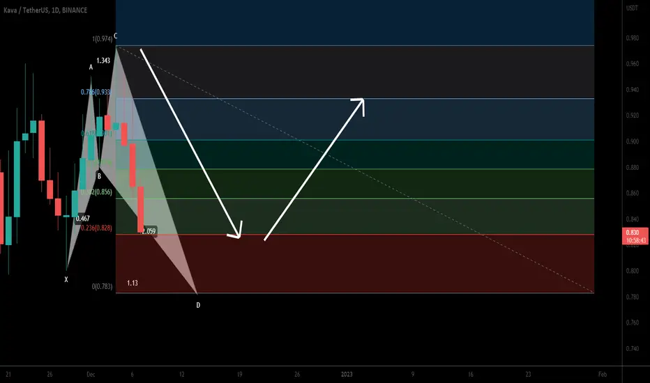 On a daily time frame, KAVA is about to complete a bullish harmonic Shark move.