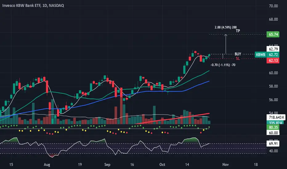 KBWB: I have a green setup signal(dot Indictor). It has an good risk-to-reward ratio(RR:). I'm looking to enter long near the close of the day if the stock can manage to CLOSE above the last candle highs(white line). If triggered, I will then place a stop-loss below(SL) and a price target above it(TP1-50%,move SL to breakeven).