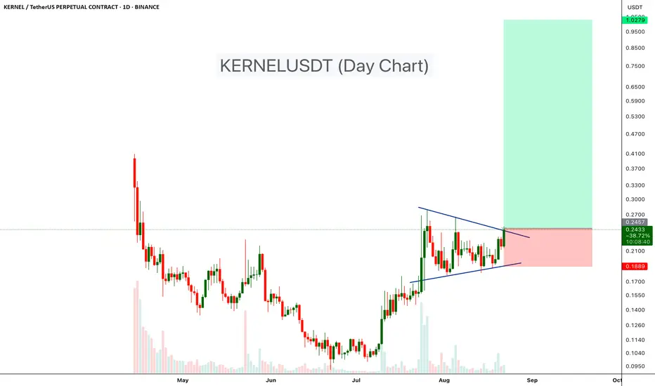 KERNELUSDT has been consolidating within a symmetrical triangle pattern on the daily chart, showing a battle between buyers and sellers after a strong uptrend. Recently, price has started breaking above the upper trendline, which could indicate the beginning of a fresh bullish move.