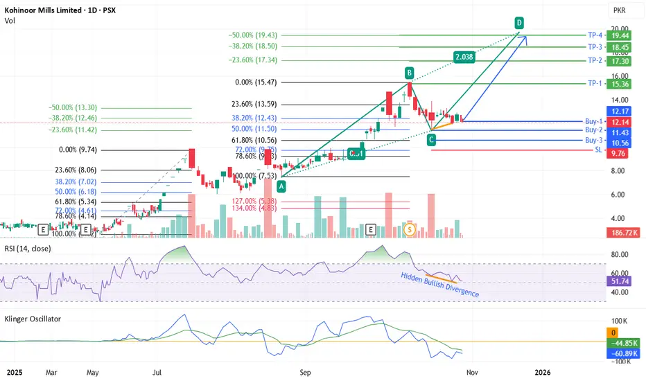 KML after the 10/1 split share price dropped from PKR 146.77 to 14.67 and then it continued its price drop due to profit booking. Historically, this SCRIP retraces to 50% Fib level before starting its next run for HH.