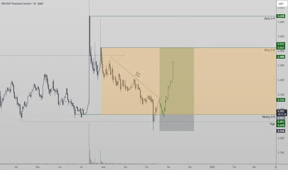 KNC has posted a significant structural shift after sweeping its April 2025 low and reclaiming the weekly support zone on a closing basis. This move often marks a transition from distribution to reaccumulation.