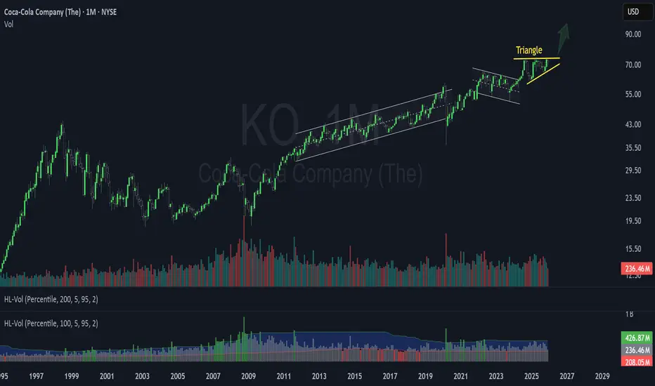 Look at how the price is compressing against that top resistance level. This is energy being stored. This is the market taking a deep breath before the next great exertion. If Coca-Cola can break decisively above these all-time highs, we enter a phase known as free rise. In this territory, there is no overhead resistance, only open sky, momentum and new buyers joining the party.