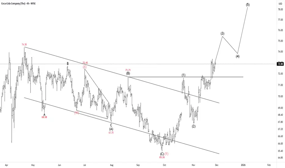🥤The Coca-Cola Company (KO) suggests the stock has definitively finished a long period of price correction and is now ready for a significant upward trend. This pullback, which had been complex, officially concluded when the price hit its low at $65.36. Critically, the strong bounce that followed has broken the stock out of its long-term downward trading range, confirming that the selling phase is fully over.