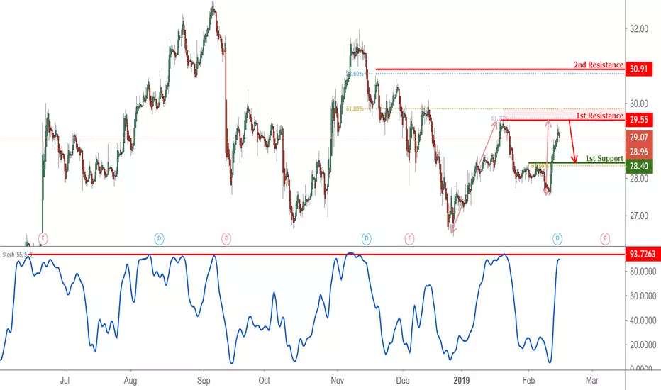 KR is approaching its resistance at 29.55 (61.8% Fibonacci extension, 61.8% Fibonacci retracement, horizontal swing high resistance) where it could potentially drop to its support at 28.40.