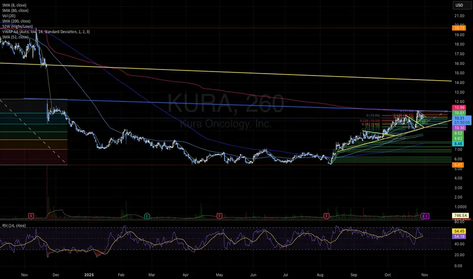 After a strong rally, KURA is consolidating above key supports between $9.50 and $9.10.