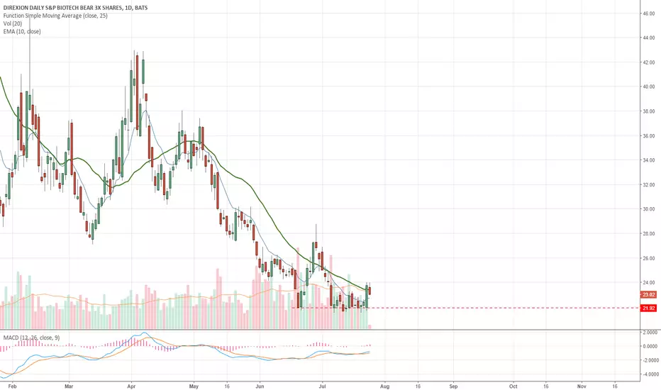With the markets possibly topping, the inverse of LABU, which is LABD may be a good long here. Looks to have strong support at $22. MACD divergence.