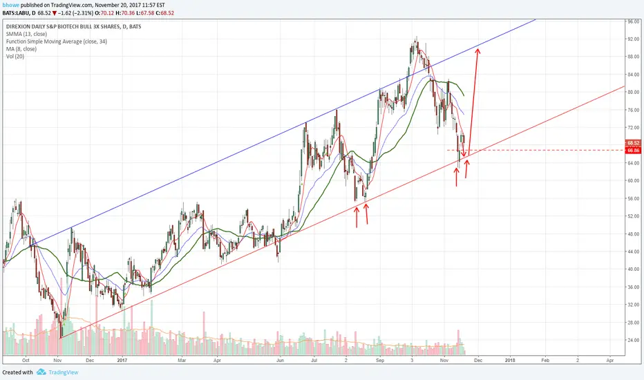 Looking to go long with LABU. Looking for a retest of the lower trend line. Previous times it bounced and retrested the break. BUY limit order at $65.50